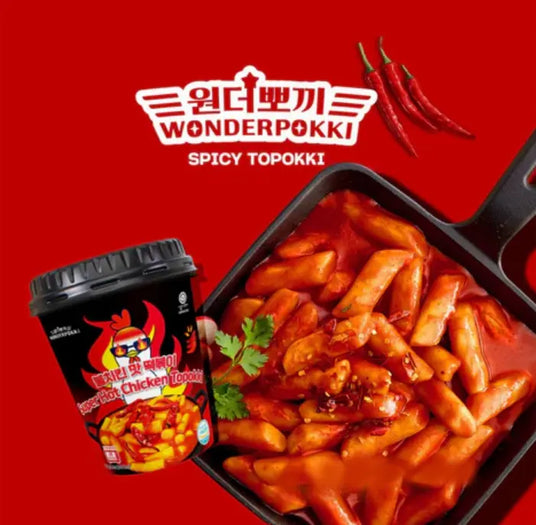 Chewy topokki is coated in a fiery hot chicken sauce that delivers bold heat with every bite. Perfect for instant comfort food cravings.
